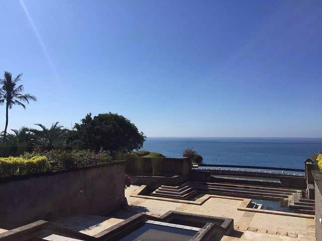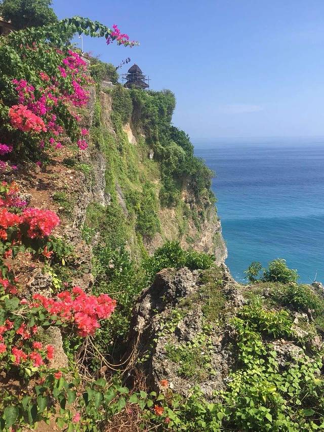 吃完早餐,导游和司机已经按照昨天约定在大堂等待啦,先出发去了当地著名的景点—乌鲁瓦图情人崖。天气很好,景色也是好美好美~先上一张情人涯的整体图。悬崖峭壁,绿树红花,远处水天一色,近处海浪声喧。感觉像是只有在童话故事里出现的与世隔绝的地方。