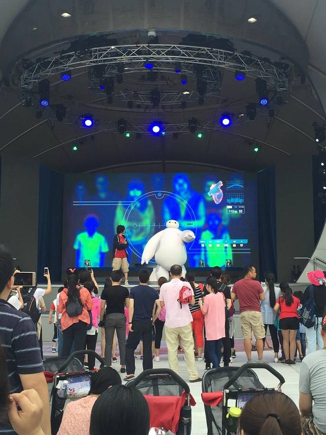 明日世界的广场上时不时有大白超酷活力秀,小朋友们可以去参与,跳的挺欢快的。