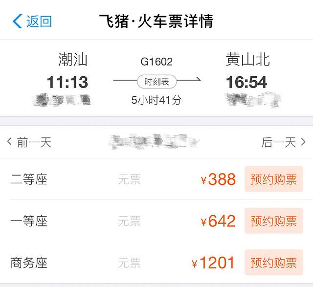 早上我们从潮汕高铁站出发前往黄山北站。习惯性地打开软件了解高铁票信息↓↓,每天只有一个班次,全程5小时41分钟,坐得屁股疼,随便点击预售期内的哪一天,都不会有余票,包括回来后没事瞎点,都见不到自行购票的可能性。后来返程的时候见识了旅行社购票的招数嘿!