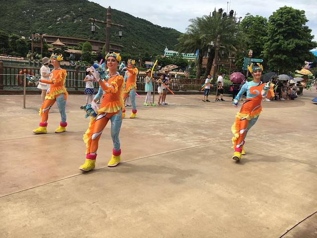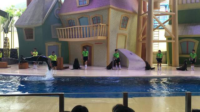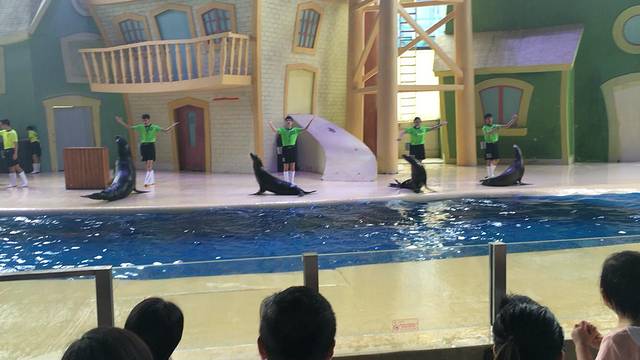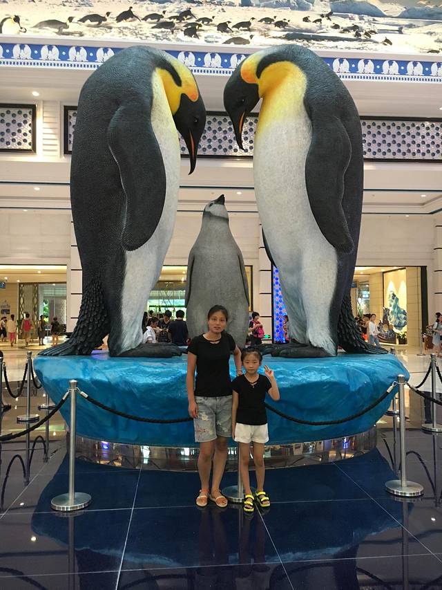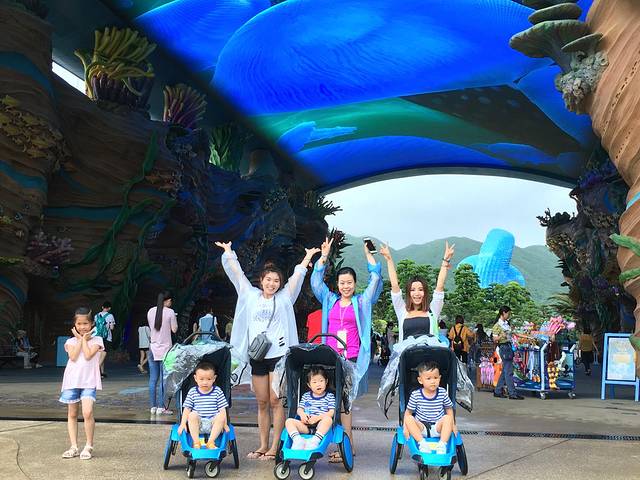 第二天一大早外面就是磅礴大雨,可乐妈妈叫了辆滴滴就直接出发去企鹅酒店,到了企鹅酒店,娃们都乐翻了,可乐妈妈办了入住手续,取了入园门票和大马戏的门票,我去办了行李寄存,正准备入园时可乐妈妈发现手表被儿子落在了弟弟民宿,叫了辆滴滴帮她把手表取回再入园,我就先带着娃去海洋王国,在入园处有个网上取票自助机,帮娃取了票,等到大家一起入园差不多10点30,由于雨比较大,小娃的妈妈们去租了推车,110元一天,如果不下雨还是不需要的,之后我们直接去看5D电影卡卡大冒险(每30分钟一场),非常不错,刺激、逼真,我娃吓得缩成一团,看完电影后我们直接去了海豚剧场看12点的海豚表演,看完海豚表演我们返回酒店吃自助餐!