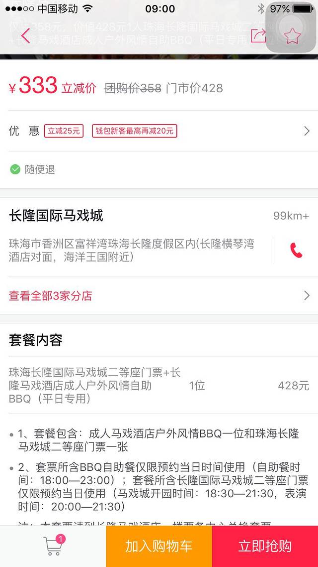 酒店套餐只有4张大马戏的票,我们是4个大人4个小孩,所以定了4份这样的套餐,包括4张大马戏的票和4个成人的大马戏酒店BBQ烧烤自助晚餐
