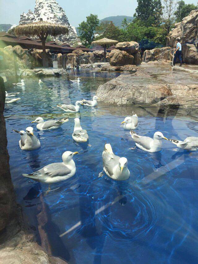 吃完饭快2点了,由于我的时间比其他3个妈妈紧,所以从下午开始我和娃单独游园,下午第一站我们来到海象山,看了会儿海狮就听见一阵一阵的尖叫声,原来是超级激流,在下面看确实很刺激,我和娃决定去试一试,到了最高点我们就后悔了,娃说她想下来,我说下不来了,闭着眼睛低着头很快就好,其实我自己也怕得要命,还好在最高点时船头180度旋转,我们是背朝下,冲下去那一刻心脏都快出来了,到了下面娃和我的腿都发软了,体验一次就够了,再不敢坐第二回了!之后我们就在横琴海附近等着海洋大巡游(第二天又看了一遍),演员们很不容易,大热天穿着五颜六色的衣服,边走边跳,还一路面带微笑,热情洋溢!看完大巡游后我们去了鲸鲨馆,游玩鲸鲨馆后我们又去坐了海底互动船(娃最喜欢坐这个,2天坐了3次),之后就去看了16点30的白鲸表演(很精彩,白鲸很可爱,尤其是那只不亲吻的白鲸,我们第二天又看了14点的场次),之后就去了白鲸馆又仔细地看了它们一回,之后就去逛了企鹅馆和北极熊馆,18点左右与其他人在冰山过山车汇合,由于时间很紧,大家在附近的超级汉堡吃了晚餐(一份汉堡套餐55),7点出发去看大马戏!演员们大多都是外国人,高大上,刺激精彩,值得一看!看完大马戏差不多9点,我们出发去马戏酒店吃BBQ自助餐,一瓶超市里8元的可乐居然卖到60元一瓶,我们买了2扎啤酒(买一送一,98元),吃饱喝足为了省钱,我们撸了一些小面包和水果当第二天的早餐!12点回到酒店,大家很快就入眠了!