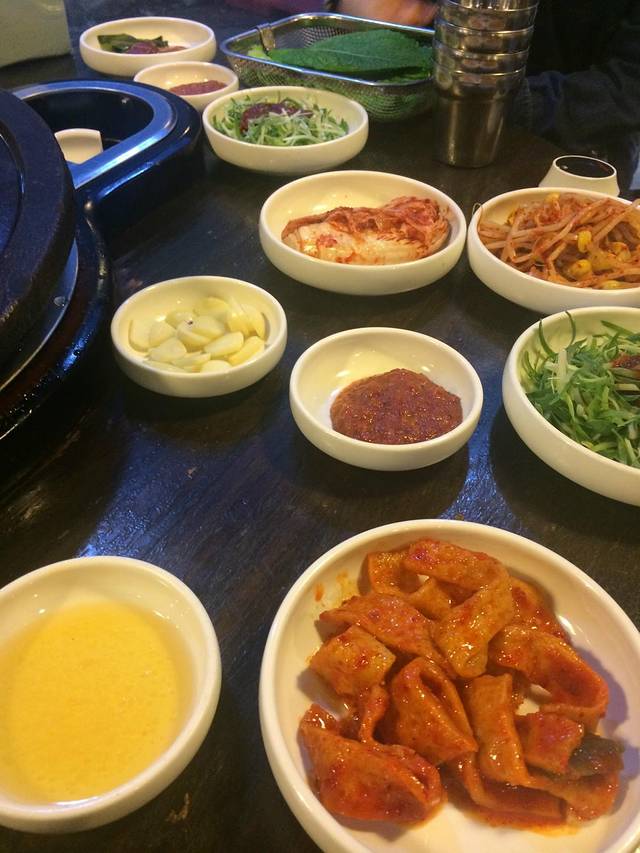 晚上和团里认识的三位美女去吃了必须在济州岛吃的黑毛猪肉。