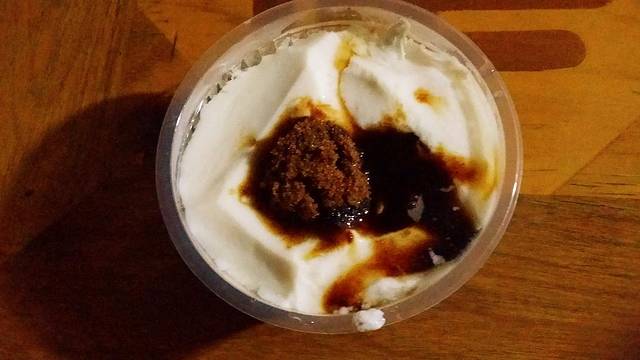 然而在古镇买到的这碗豆腐花,却是豆腐脑加上红糖粉,拿在手里,我好一阵讶异,店主大娘见状,笑着和我说:“用勺子将它们拌匀,就可以吃了”。感觉像吃了一碗豆腐糕一般。