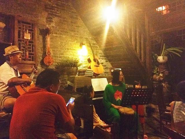 本打算回房洗洗睡了,准备起身时听到,有非洲鼓声,钢琴声,吉他声。寻声而去,音乐是从隔壁“阿姚的房子”传来的,随即便在“阿姚的房子”呆着,和其他到古镇的游客,以及“阿姚的房子”的住客一同听歌、唱歌。