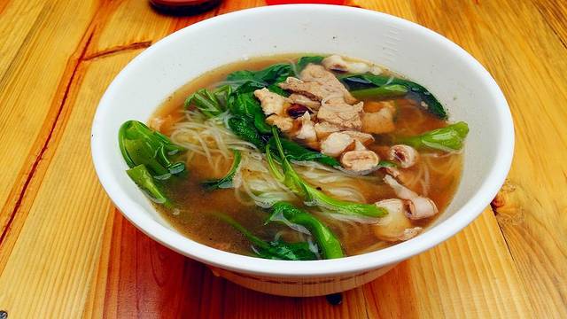 找到一间卖吃的铺子,买了一碗这个,名字真的不记得了,内容是:空心菜、粉丝、猪肝、猪肉、猪粉肠、还有黄姚有名的豆豉酱。要我说味道怎么样,味道也就那样...