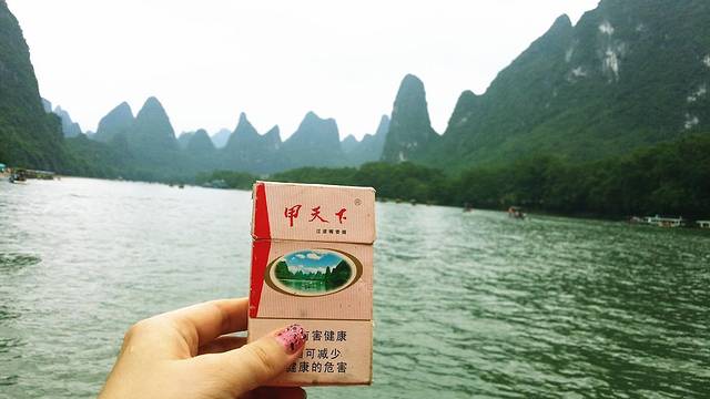 黄师傅边开船,边做讲解,这座山像什么,那座山像什么。还拿了“甲天下”的烟壳给我做对比,告诉我烟壳上的风景是真真实实存在的。