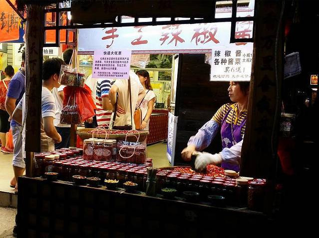 踏着被雨水洗净的青石板路,趁着天色未黑,在古镇里无目的地闲逛,看看卖衣服、饰品的铺子;驻足酱菜摊买酱菜;这儿拍拍那儿拍拍。