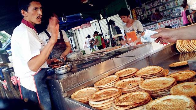 在桂林火车站门口看到新疆的“买买提”在卖烙饼,一看这烙饼立刻让我想到《西游记》,唐僧师徒到火焰山,师徒在当地化缘,当地人就给他们烙饼,那烙饼和这个一模一样呐,闻着香,看着好像挺好吃的样子,5元买了一个。