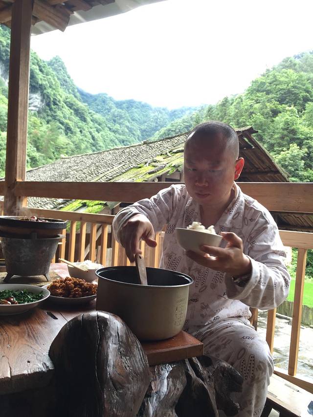 山村的清晨,格外宁静,入耳的是阵阵鸟鸣,还有厨房灶间传来的“哔哔啵啵”的柴火燃烧的声音。老吴夫妻四点钟就起床为了即将远离的游人们准备早餐:稀饭丶酸菜炒饭丶面条......我们叫老吴给我们蒸了一只他自己养的土鸡,这是在城市有钱也吃不到的东西。香!有嚼劲儿!