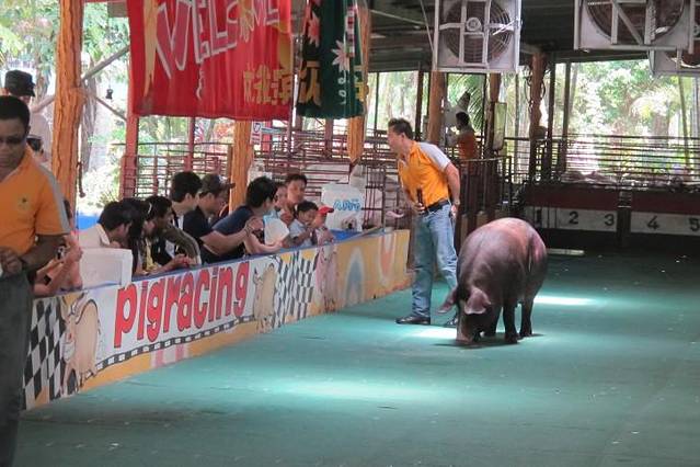 是拉差龙虎园是一座以养殖老虎为主的养殖园,您可看到老虎和猪共处生活的奇景,园内有目前泰国唯一女驯鳄师和凶恶的鳄鱼精采演出,亦可观赏可爱的猪赛跑,还有人蝎共处观看区、动物喂食区等,还可和可爱的动物照相。