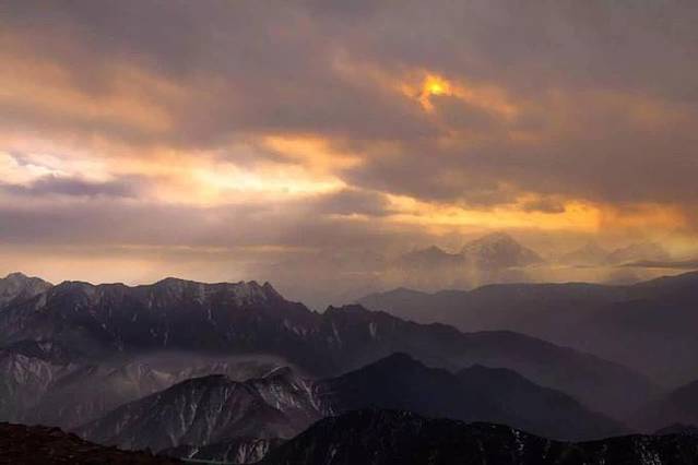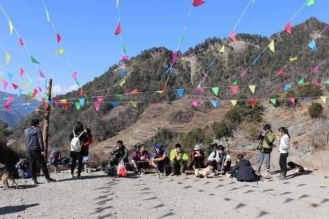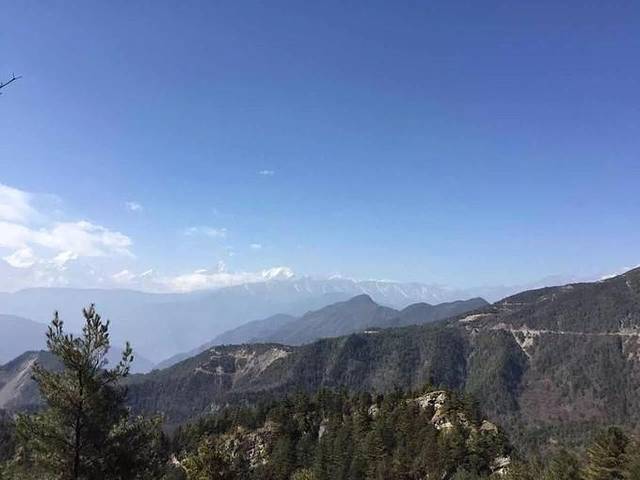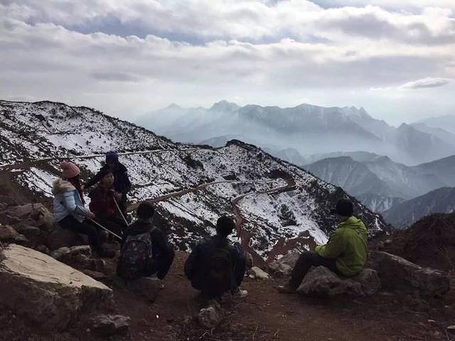 街心花园处在半山腰,也是渔进沟和长海子的路线交汇处,景致不错,放眼望去,刚好能够看清蜀山之王贡嘎雪山。到这儿的时候,距离出发已经过去将近五个小时,9个人的体力都明显打了折扣,最后经过商讨,决定让倪胖美女和肖肖一起包越野车上山,同时帮大家把行李先运上去。从街心花园到牛背山山顶包车价格大概90~150之间,成交价格全靠砍,全程大概需要一个半小时...最终我们砍到100一人(上山后我们才知道同辆车上有人砍到了90,司机说,我们只有两个人但拿了9个人的行李 所以贵)
