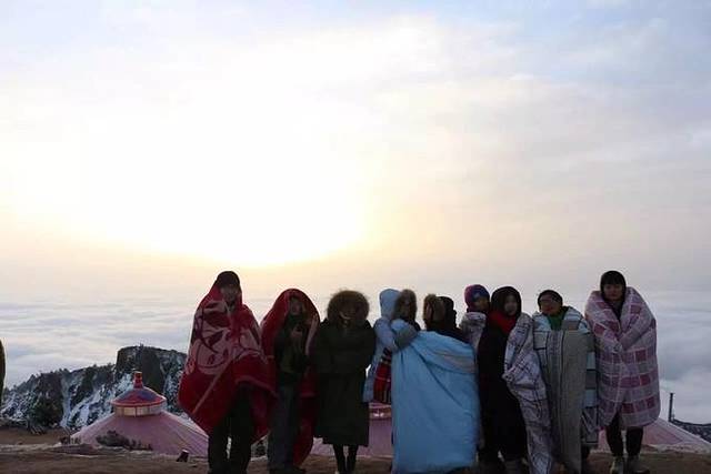 七点过,我们一起重新出门,坐在地上等日出。毕竟一人一床被子,声势太浩大...弄得旁边本来准备拍日出的人都来给我们拍照了...