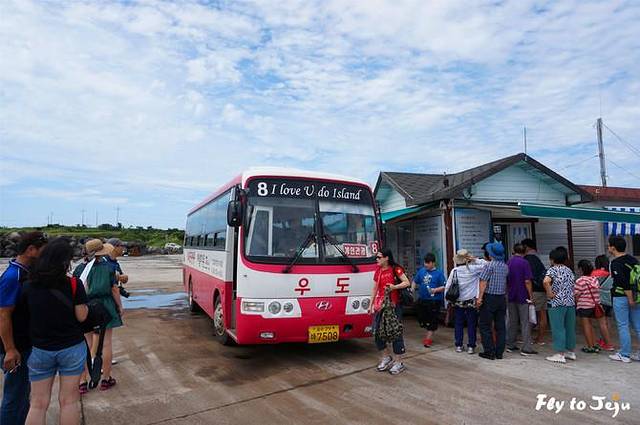 票价5000韩元,坐有红色牌子的车,蓝色牌子是给旅游团预订的。