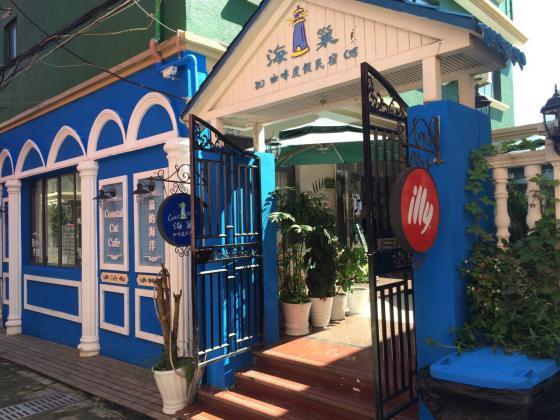 我不喜欢早上睡觉被海浪叫醒的感觉,因此我住在了距离大海步行5分钟的清净地带——海巢咖啡度假民宿。民宿地理位置优越,出门不远处就有大排档、小卖部和公交站台。民宿靠山面海,一楼大厅拥有视野开阔的落地窗,很有格调的露天小院子,房间有星级酒店般柔软的大床。这一切是我喜欢的。下图为酒店在订房网站上发布的图片。