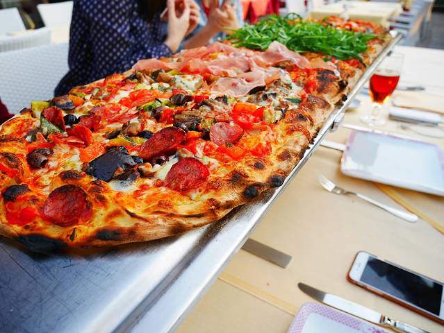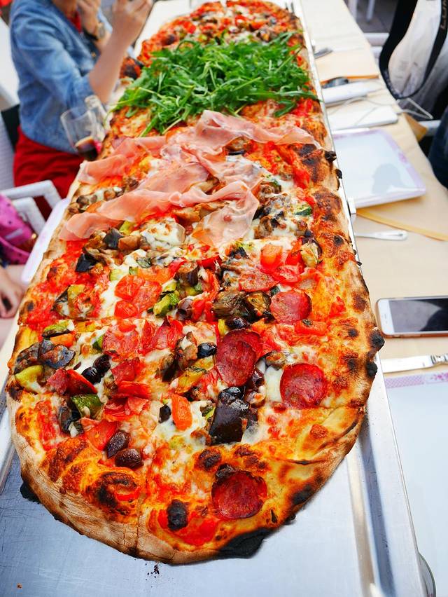 我们一共8个人点了两份餐厅最出名的一米长的披萨,这种披萨可以有三种口味选择,有烤肉味、蔬菜味、海鲜味等等,包你吃到爽,而且当地意大利人真的把当吃披萨和吃饭一样。