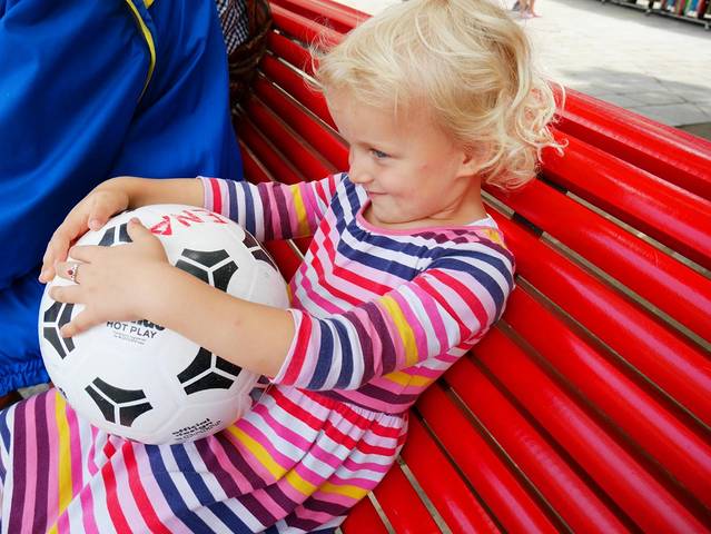 小姑娘和我玩扔足球,我想和她来个合照,她却腼腆起来