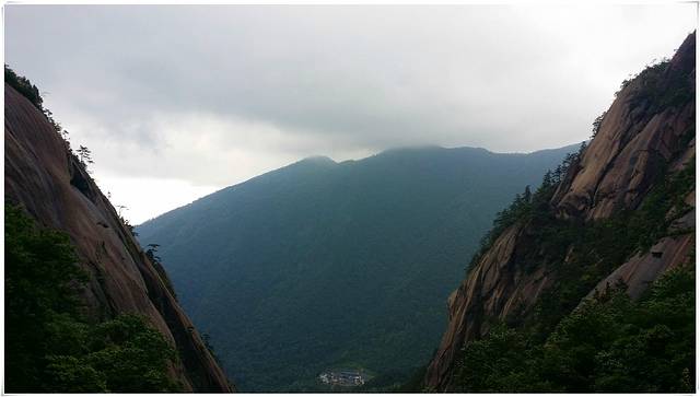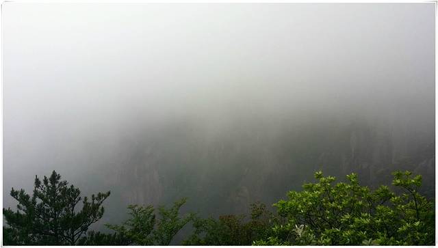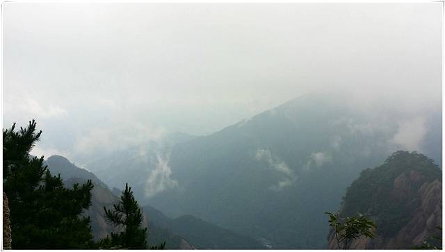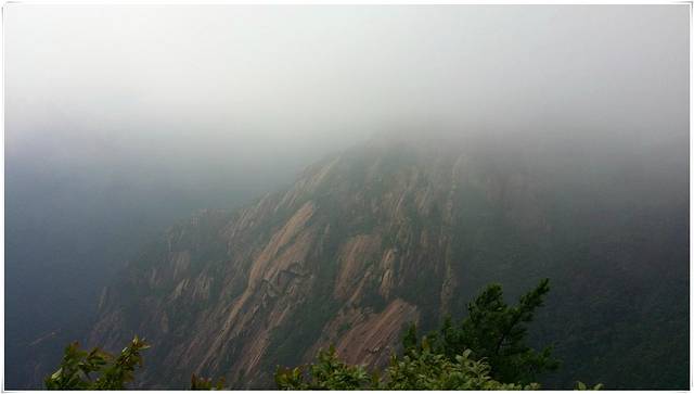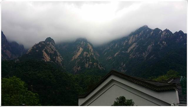 从山下黄山售票点俯瞰山顶犹如仙境,云雾遮蔽,看不到山峰。