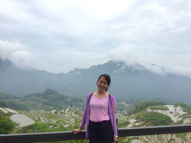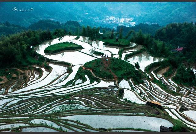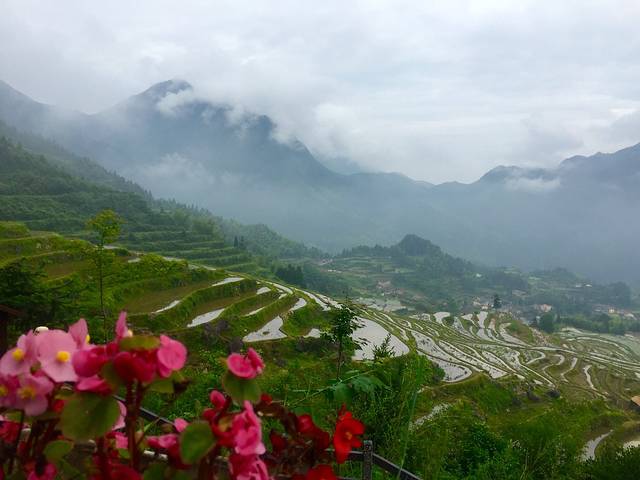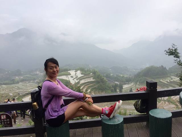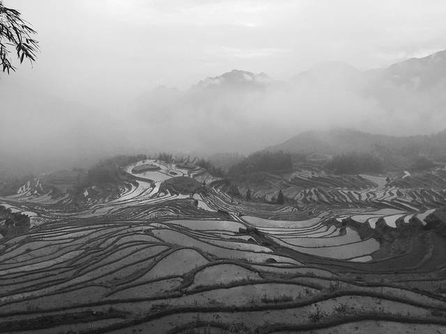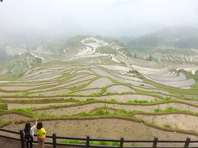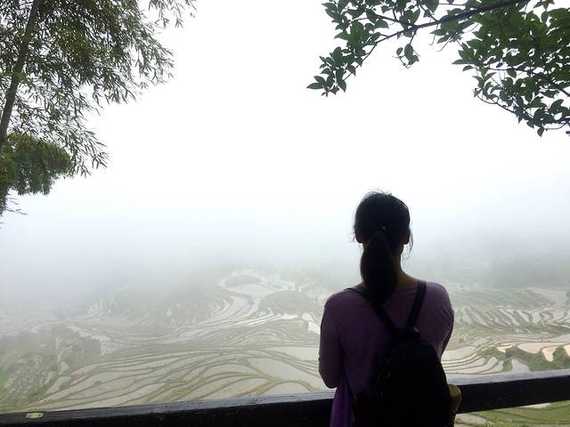 第二天,我没起得来看日出,起床整顿完毕已是七点,出发去九曲云环看梯田。从白银谷到停车场到九曲大概十五分钟车程,九曲有停车场,车停好下来便是观景平台。我们去的时候正好起雾,观景平台云雾缭绕,梯田如梦似幻,犹如羞涩的少女遮着面纱。至此我终于明白什么是云-和-梯田。沿着平台的栈道一路往下走,云雾渐渐散去,梯田渐渐露出绝美的容颜。灌水期的梯田犹如仙女打碎的银镜散落人间,绿色和银色相互交织,层层叠叠,高高低低。栈道边有台阶,顺着台阶可以走到梯田中间。放眼望去,梯田宏伟壮观,不禁感叹农民的辛劳和伟大,造就了人世间这样的美景。