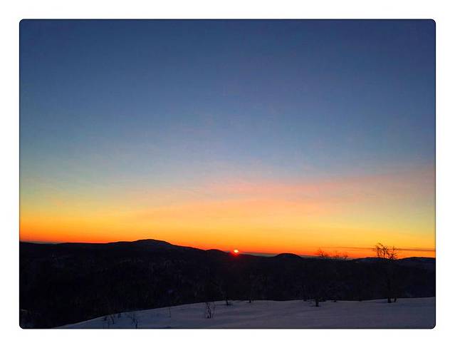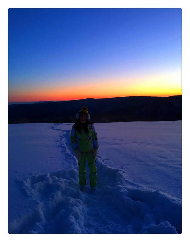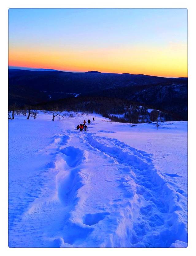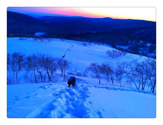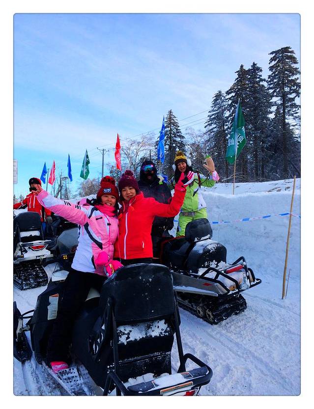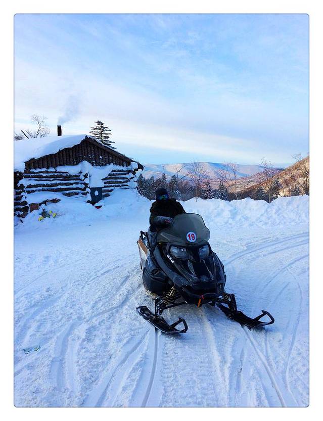 凌晨五点半出发,六点抵达山脚下,雪地摩托车一车载上两人开往山顶处