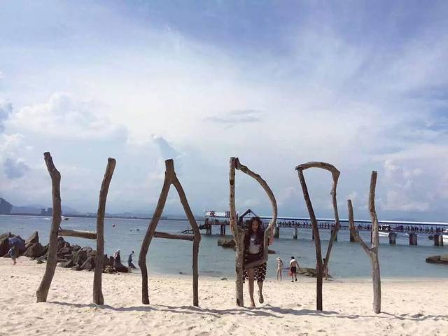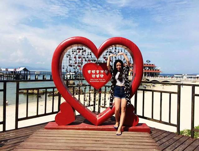 蜈支洲岛一日游,我们就是经济游,只买了门票和船票,去感受下海岛的气氛,花钱的项目玩不起就先都存着以后和男朋友来。蜈支洲岛真的是很适合情侣的岛屿。连奢华游的票价都是1399说是象征岛屿老板和妻子一生久久的含义。岛上情人桥照相的都是一对对的情侣,我们俩都不好意思挤上去拍照。这里的海不同于亚龙湾的是它的沙滩,亚龙湾的沙滩真的是三亚这几个地方最细柔白净的,这里的沙滩有很多小珊瑚小贝壳有些隔脚,但我们还是抵挡不住它的美,在沙滩上疯狂的拍照。