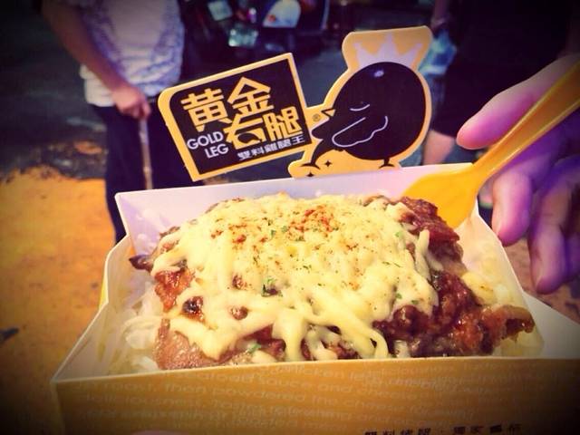 黄金右腿也算是逢甲夜市一道创意十足的美食。在鸡腿肉上面铺上一层厚厚浓浓的起司,将起司的味道融入鸡腿香气中,鸡腿肉吃起来非常的嫩又多汁,最后加上莎莎酱,真是美味极了!