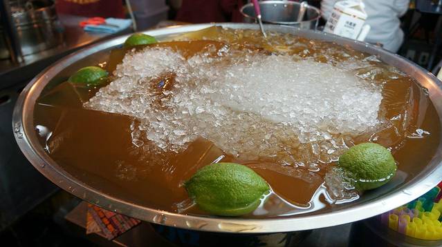 夜市的冷饮形形色色,在很多冷饮摊点会看到类似一大锅,卖相就很清爽。这就是所谓的爱玉~一种很棒的植物果实,透明的,味道酸酸的,伴着牛奶或者果汁喝,很清凉也很爽口哦~