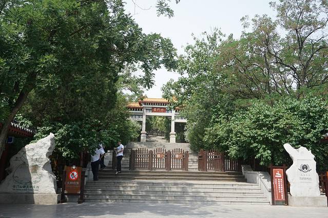 一路登攀,半山有望寿阁。置身阁中,仰望南山,恰见崖巅寿字,故名望寿阁。匾额为启功题写。