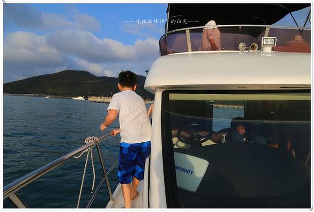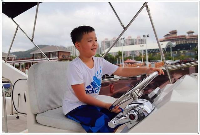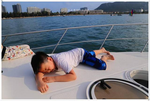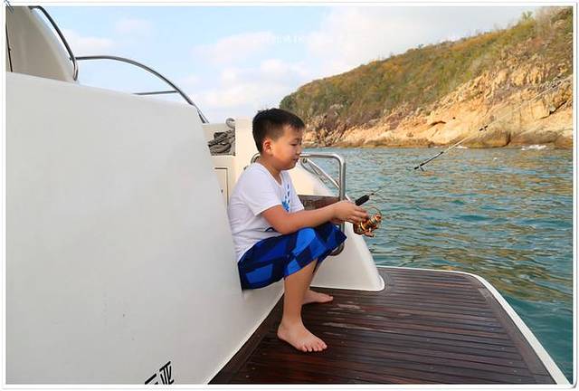 游艇停下来的时候,晃得厉害,会晕船。儿子开始海钓,游艇上配有鱼竿,但看表情,小子已经有点晕了。