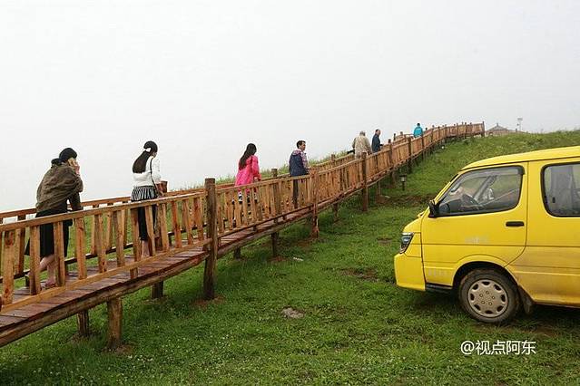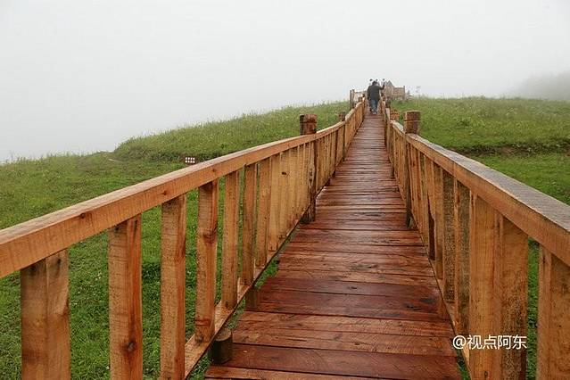 下午5:30,终于来到了草坝生态农场。之前还下着的小雨,顿时停了。但农场周围,只见迷雾一片。纵然如此,绿草如茵,山花烂漫,雨雾仍掩饰不了草坝的生态之美。沿木制长廊踱步而上,大家左顾右盼一路观光,并纷纷拍照留影。