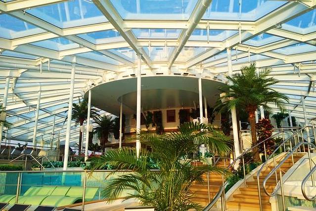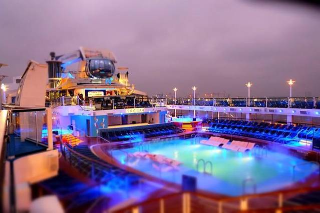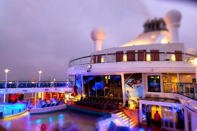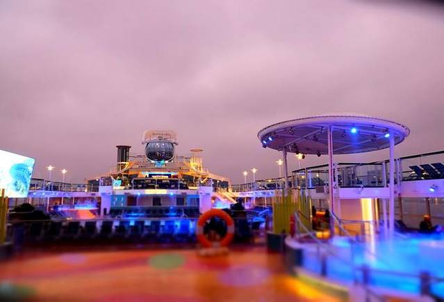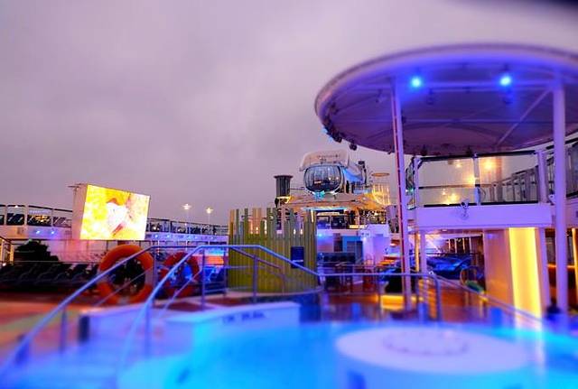 夜幕降临,去逛逛量子号,一颗正在等待惊喜的❤️。从14层的帆船自助餐厅出来,走到头就是甲板,这里有一个户外游泳池,感觉更像是嬉戏游玩的水池,怎么水面上雾气腾腾,难道水是热的。一摸确实,哇塞,好贴心呀。泳池的一侧是一块大型LED屏,会播放各种电影🎬,还会随时间显示日出日落🌄🌅泳池的背后就是那无处不在的北极星✨