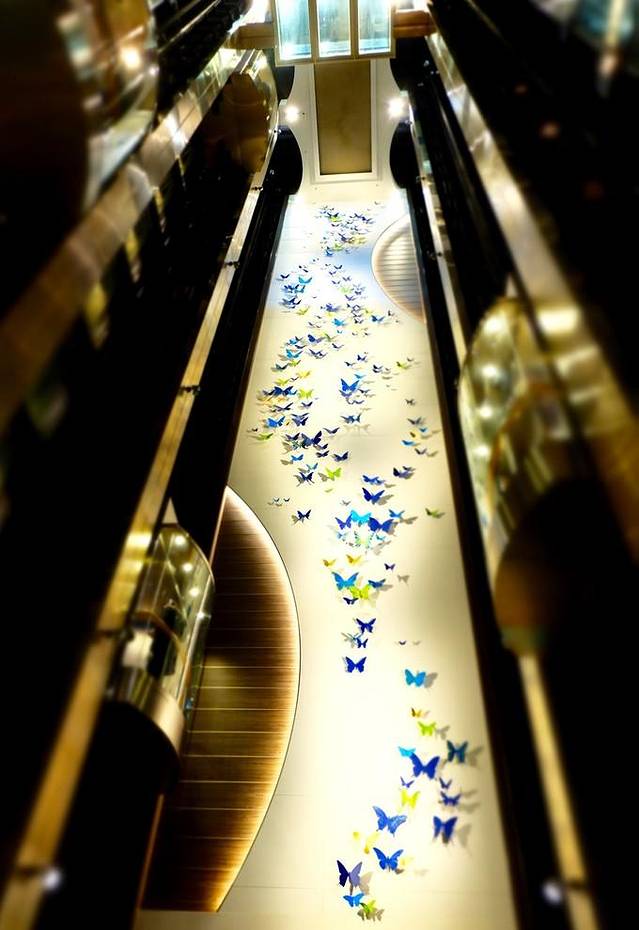 在量子号中段有十二部观光电梯供游客使用,电梯之间有一副大型的蝴蝶墙。其中有些电梯还很有巧思的开门见喜,一大波的animal正在袭来。。。
