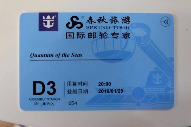 上面说过了,非常重要,你在量子号上所有的活动都要靠它。上船后去四层服务台绑定你的银行卡,然后就可以消费了,不绑定也可以,上面有300美金的透支额度,不过下船前一天一定要结清,否则,嘿嘿嘿。银行卡可以各绑各的,也可以一卡拖多人,像我们四个人两个房间都是绑定我的信用卡,这样对结账单的时候也一目了然。房卡上面会有你的名字(被我涂掉了),人多尽量不要拿错。还有一个“用餐时间”,这个是船上除了14层自助餐厅外其他免费餐厅的就餐时间,只有晚上提供,比如我的房卡是晚八点,可以提前一刻钟过去,有的餐厅会排队,人坐满就不进了。