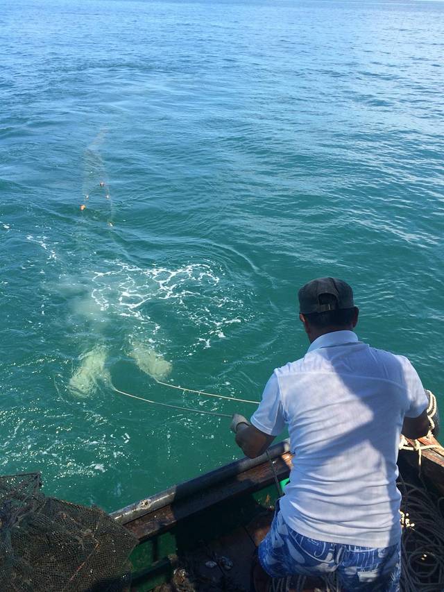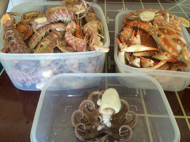 吃完饭后一个阿姨约我们出海捕鱼,长辈一致说好,我们五个人包了一搜大船,海水超清,真想直接跳下去游泳,收获也挺多,都是赖尿虾,蟹和鱼,因为房间有冰箱和电磁炉,我们都是自己煮的,虾和蟹直接白灼,鱼放在冰箱留晚上,立刻打上来的海鲜就是是不一样,刚吃完饭的我们围在一起一下子就全吃了,搞好又开车买了晚上和明天早上的材料,搞掂都差不多六点,正是游泳的时候。