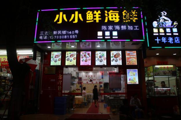 从蜈支洲岛回来下午六点多,晚饭当然要去吃海鲜啦,第一市场,三亚很有名的老街,一到这里好多海鲜加工。涌上来好多大妈给我们发小卡片介绍海鲜加工,担心被坑所以没敢选择这些店,打算自己搜寻。顺着海鲜一条街找到了一家很干净的店面小小鲜海鲜