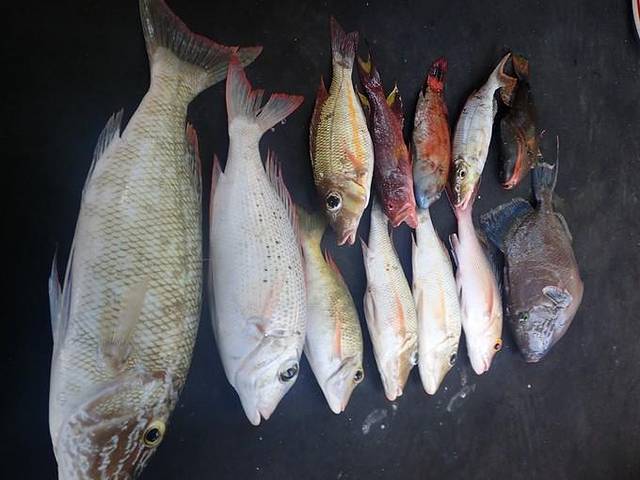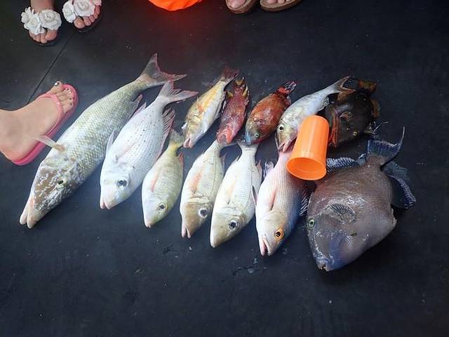 上午一共有四个钓点,导游和船长准备了鱿鱼和小鱼作为饵料,没有鱼竿,一盘鱼线就是全部的钓具了,是不是咬钩全凭手指上的感觉。船上的14个小伙伴经过两个多小时艰苦努力收获颇丰。不过我很惭愧的承认我一条也没钓上了....我是喂鱼组的,哦,对了,我还是吃鱼组的╮(╯_╰)╭