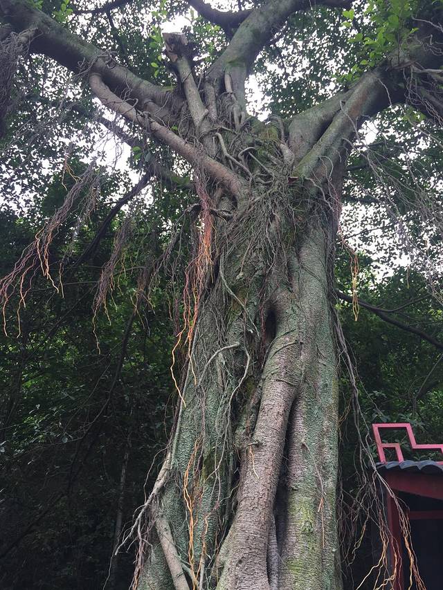 下山之后等公交车时拍的、这样的榕树四川随处可见!生命力极强、树杆千奇百怪、杆上还会生张出树根!有一定的欣赏价值,是当地的道路、公园主要绿化树种。