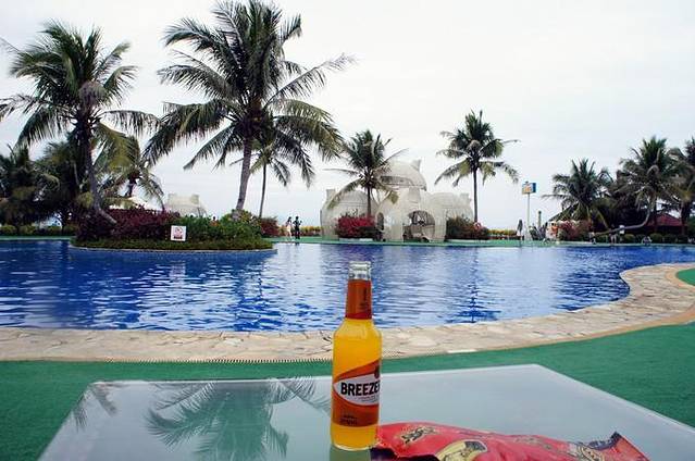 坐在泳池边开始我们的午餐,男友背来得鸡和酒,鸡是我们来时从网上买的,我家特产,我的最爱~~此情此景,美味相伴,人生美妙不过如此嘛。在此感谢男票不辞辛苦,好男人赞一个对了,在这说一下,这个泳池是收门票的,每人最低消费48元才能进来,如果有120元的电瓶车票,可以优惠,每人只要20元,还送两杯饮料,就是好难喝的说,我俩喝了一口都扔掉了。