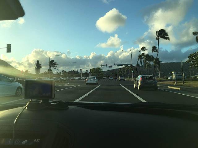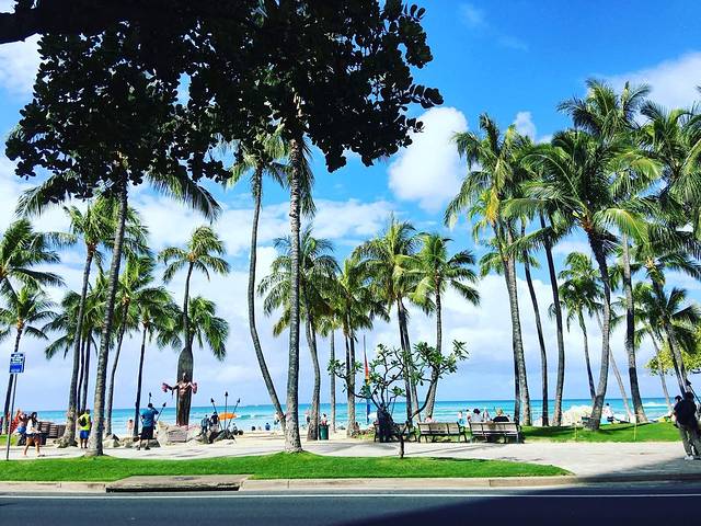 吃完早餐,去凯悦酒店里的Hertz租车,夏威夷去各个景点还是租车出行比较方便。途中Kalakaua大街白天的美景记录一下,印象中的夏威夷就是这样一个蓝天白云椰树映衬帆板少年的活力景象。