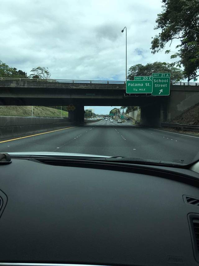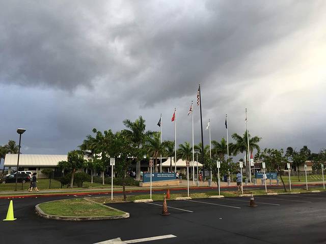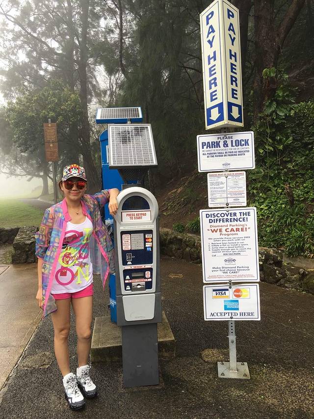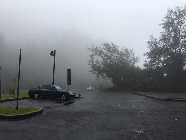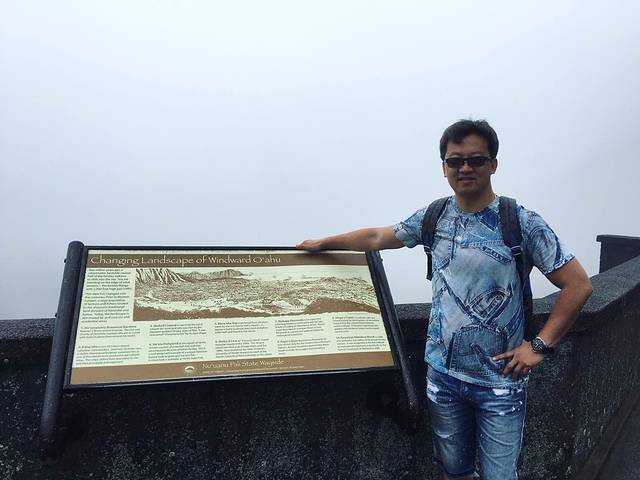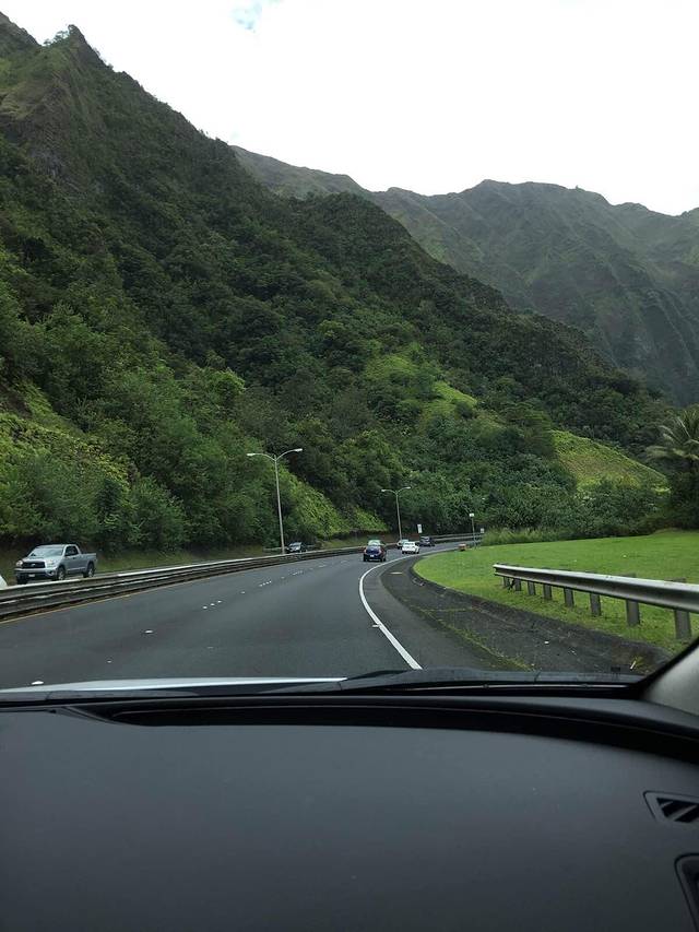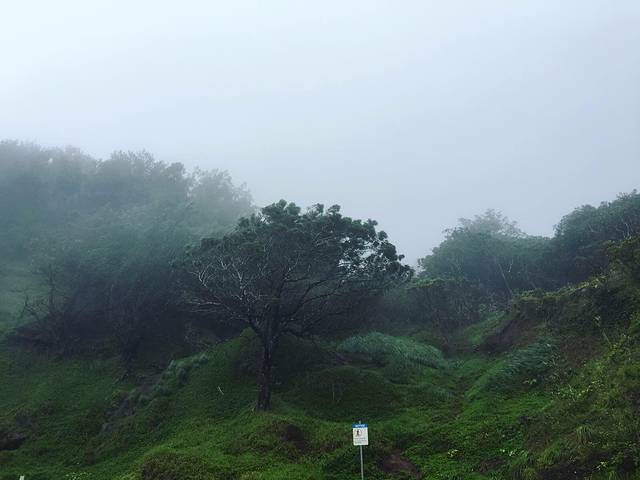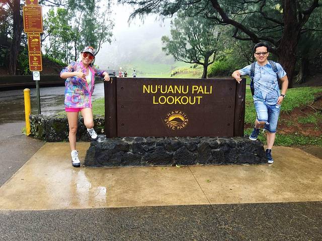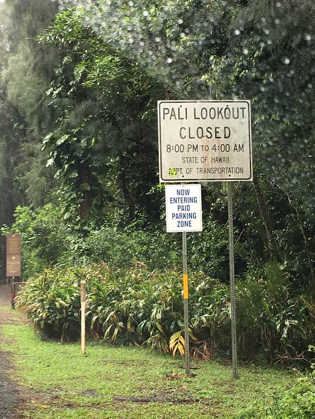 早餐后开上车,我两又撩出去了。从艳阳高照的威基基海滩开出来,这一路便开始风雨大作,20分钟左右从Nuuanu Pali Drive出口出来,看到白色指示牌,以为今天关闭了呢,开近了仔细看才清楚地看到是关闭的时间指示牌。