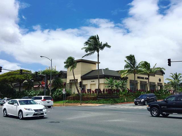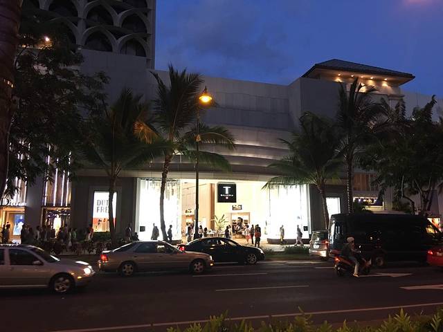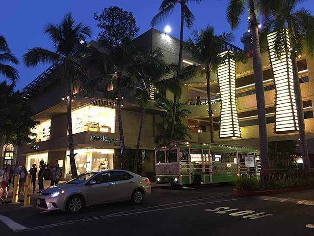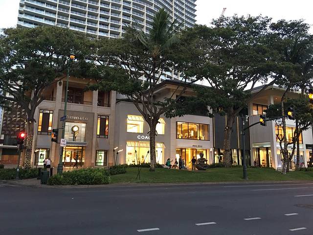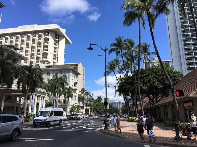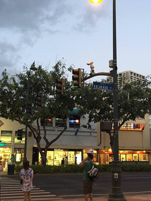 从酒店走过来十分钟左右,看到红绿灯柱上的大街名字了吧~Kalakaua大街,夏威夷最繁华的商业街,皇家购物中心和DFS都在这边,各种奢侈品大牌和餐厅云集于此,每晚消磨时间和觅食的好去处。