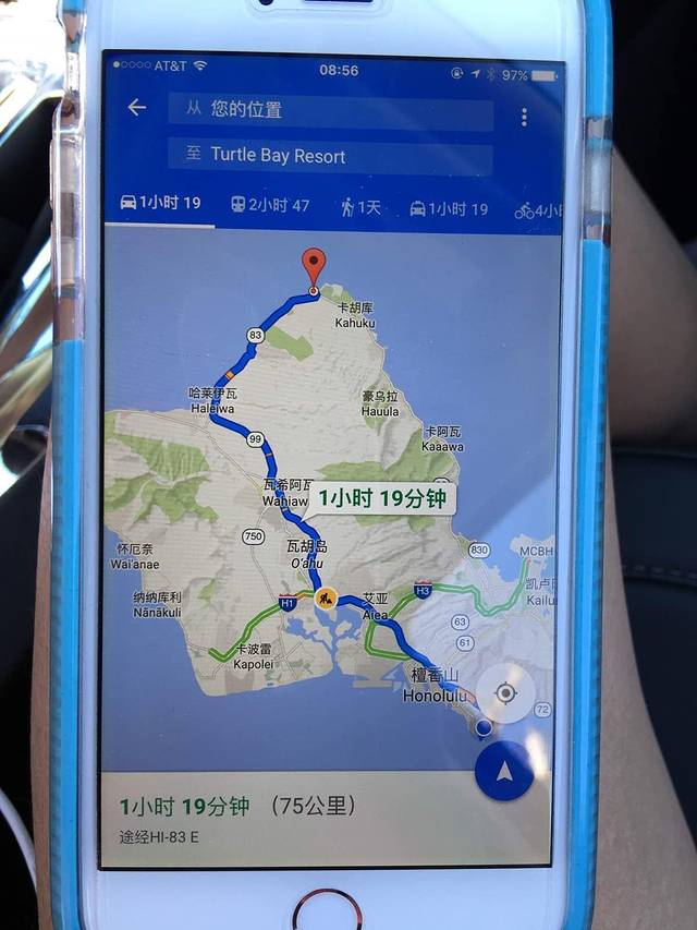 调出导航,出发。(起点:手机下方钻石头山,终点:Turtle Bay Resort。)