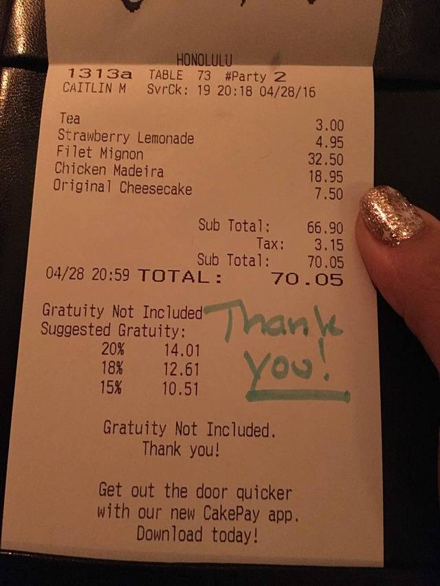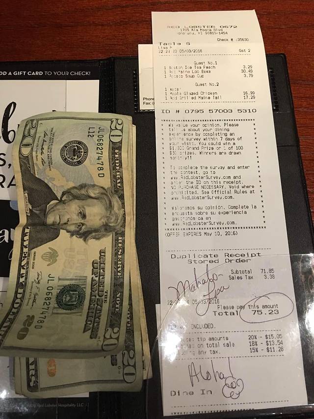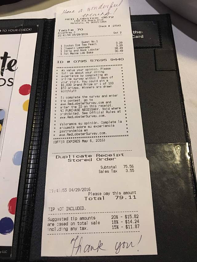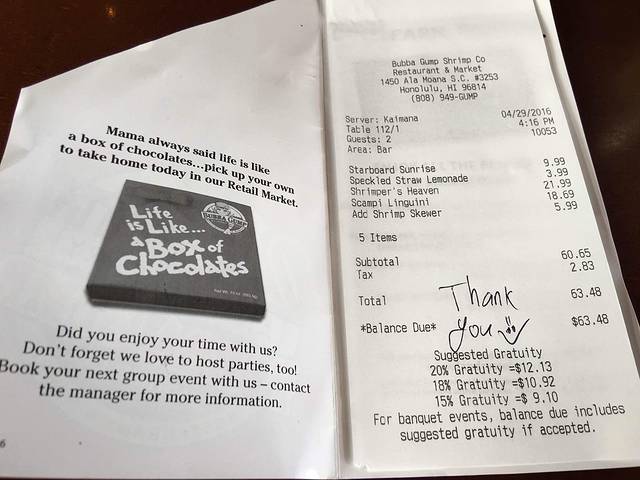 在美国用餐,除了餐费和税外,都要额外附加小费的,小费在结账单最下面有三个百分比建议,都是算好的,按照你的满意程度加到餐费里就好。