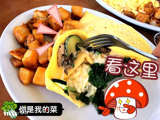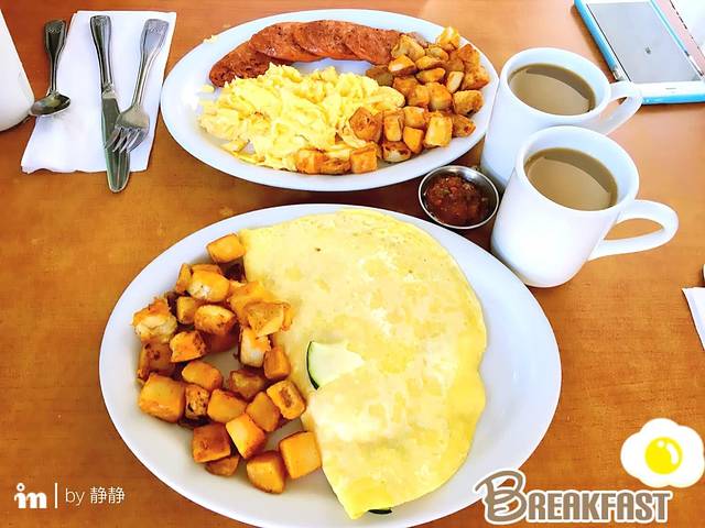 和想象的美式早餐略有出入,没有主食面包,光是鸡蛋土豆肠,感觉没吃饱。还有提醒一点,就是我点的牛奶竟然是冰的,也怪自己点餐时没有说要热的,想当然的认为和国内是一样的,结果被告知牛奶没有热的,于是又要了杯咖啡。