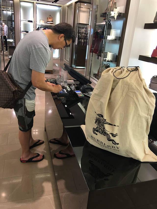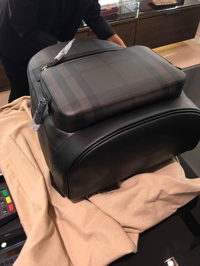 老公在DFS相中了B家这款双肩背,当时打八折,1195美金购入,当时可以背走。(商场一层的Burberry可以当时拿走,三层的交了钱只能机场提货。)