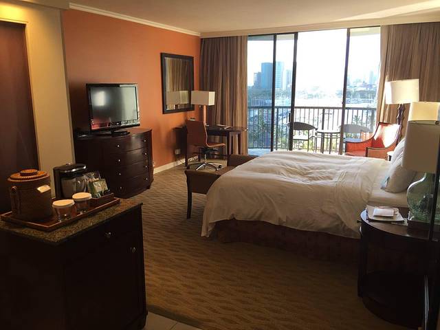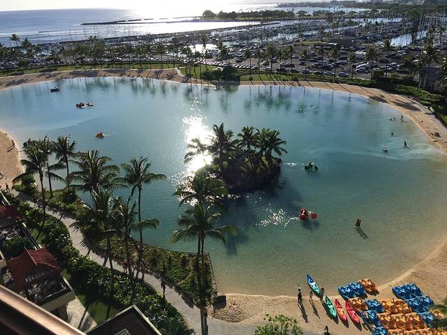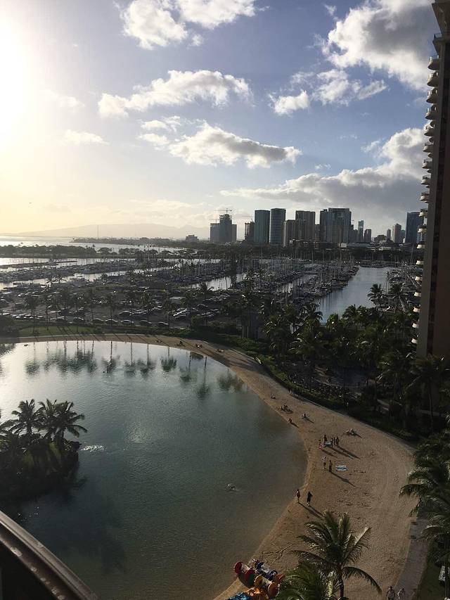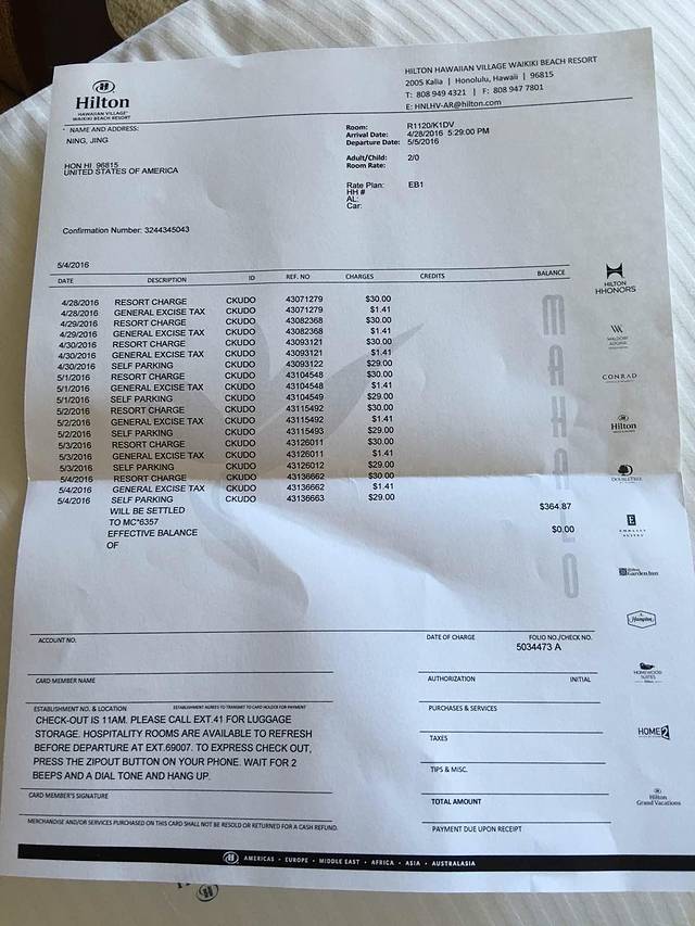 这次旅行真的算是说走就走啦,之前有想法,但因各种原因一直没能成行,机票是临行前10天在网上敲定的,夏威夷航空,两个人含税和保险一共14186元。(来回升舱到优逸经济舱,都是柜台添钱直接办理的,北京这边是1600元两个人,夏威夷那边是250美元两个人。)酒店也是网上预付的,Hilton Hawaiian Village(希尔顿夏威夷度假村),这里提醒大家一下,夏威夷有好几家希尔顿,位置不同,我们订的这家在Waikiki海滩上,景致很棒。看过评价后,预订的彩虹楼的海景房,楼层高景色优,七晚总价15431元。每天晚上另外有30美金的度假村税要到酒店前台现付。