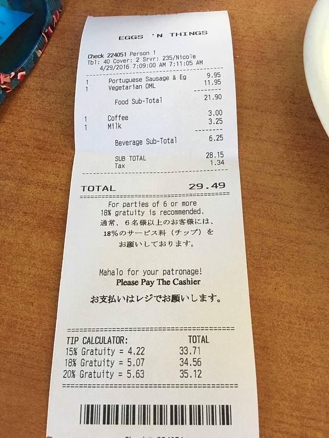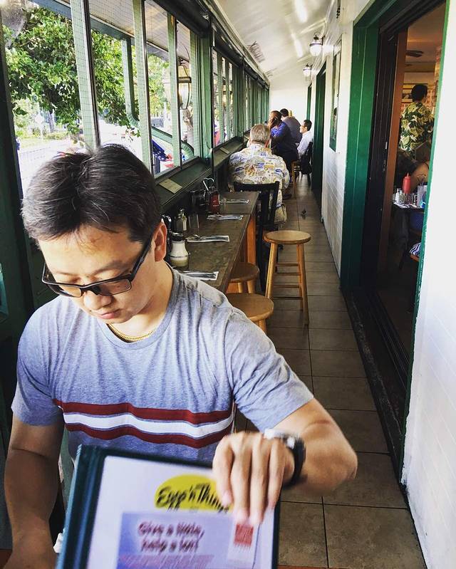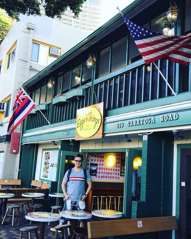 当地著名的早餐店Eggs’n things,从酒店导航走过来,不算远。我们到得早,没有等位排队,一层拿叫位牌,震动后可直接上二层就坐点餐。