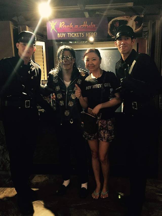 溜达到在皇家购物中心的一层草坪附近,听到熟悉的Michael的声音,透过拥挤的人群,瞥见舞台上灵动的身影,像极了Michael。简短的十几分钟的精彩表演过后,我尾随着要求与“巨星”合影。