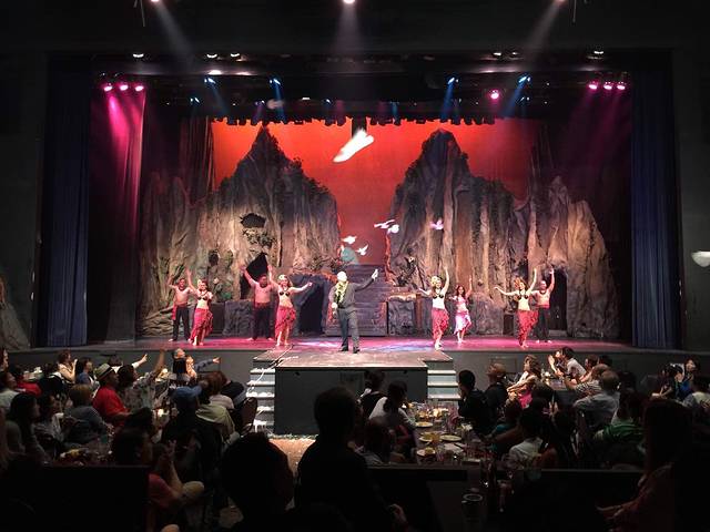 买了没有含晚餐的Vip票,158两个人。入场后才知道没有包含晚餐的座位在相对靠后的高台儿上,尽管是Vip贵的票,也是在后面一些。前面都是吃晚餐看表演的,不过整个场地就不是很大,所以坐在哪里都看得非常清楚。