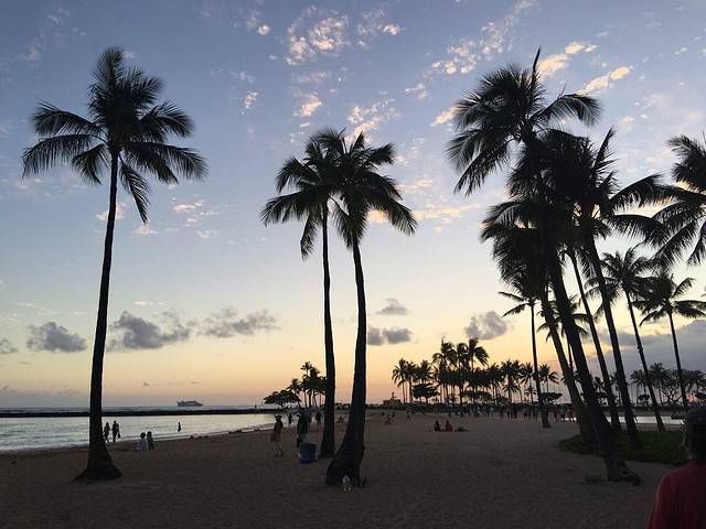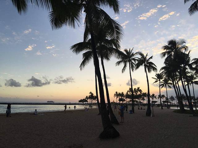 六点从购物中心出来,沿着Ala Moana大街溜达回酒店,大概也是2公里左右,夕阳西下,海风阵阵,沿海的风景棒极了。